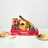 A curated selection of fine cheeses, gourmet crisps, sweet accompaniments, and a touch of indulgent chocolate—beautifully paired with a refreshing white wine. This basket offers a perfect balance of savoury, sweet, and crunchy elements, creating an elegant tasting experience for any occasion.